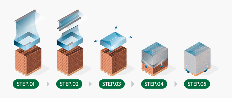한장의 필름을 늘려 팔레트 전체 제품을 포장하는 방식으로 복원력이 우수한 필름